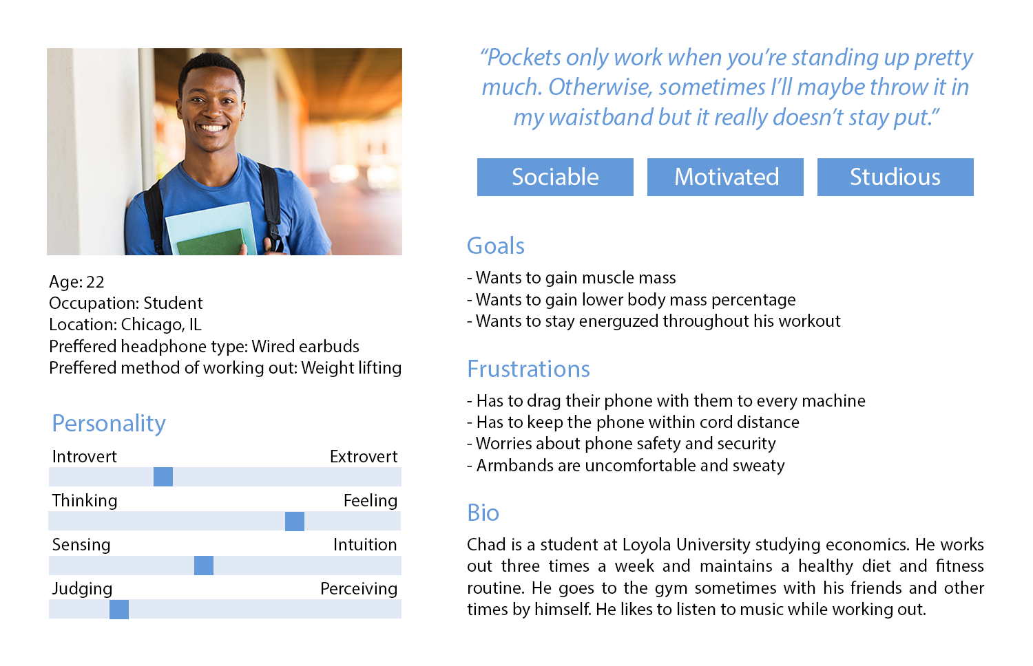 Research results showing weightlifters having more problems with phone placements helped us narrow down our user group to weightlifters. After analyzing the results and responses of our surveys and interviews, we highlighted some key patterns and developed a user persona.